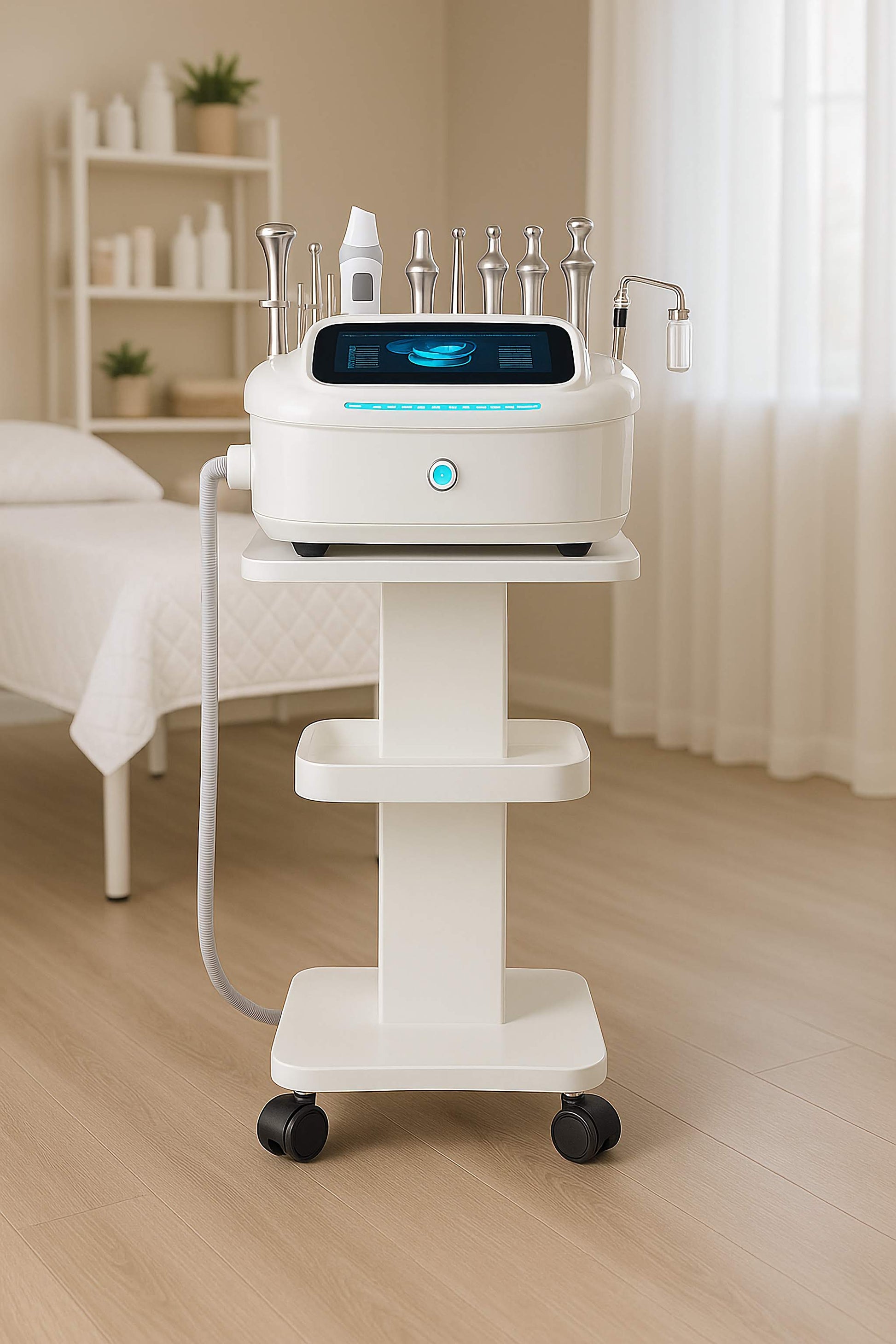 Com 10 funções integradas, esta plataforma oferece desde limpeza profunda da pele até tratamentos de rejuvenescimento, lifting facial, hidratação intensiva, entre outros. Tudo num só equipamento.